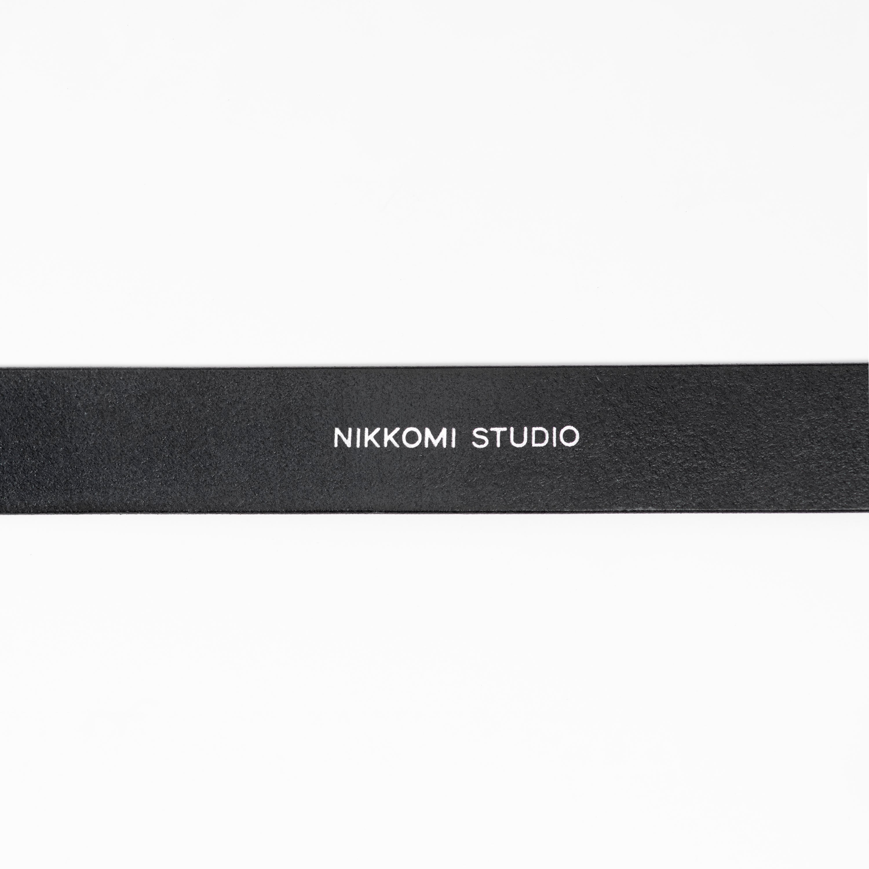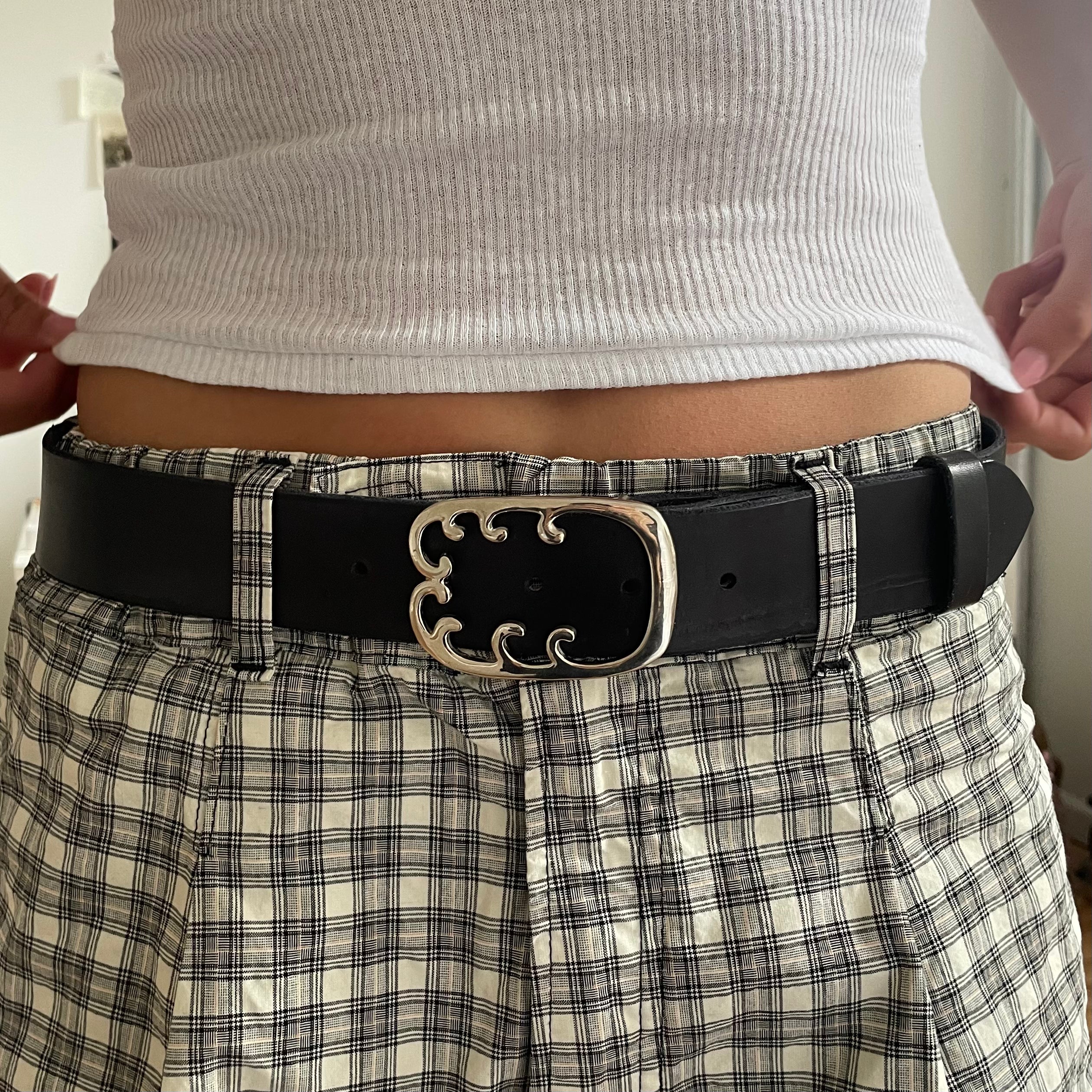 Silver belt buckle with hand stitched black genuine leather strap